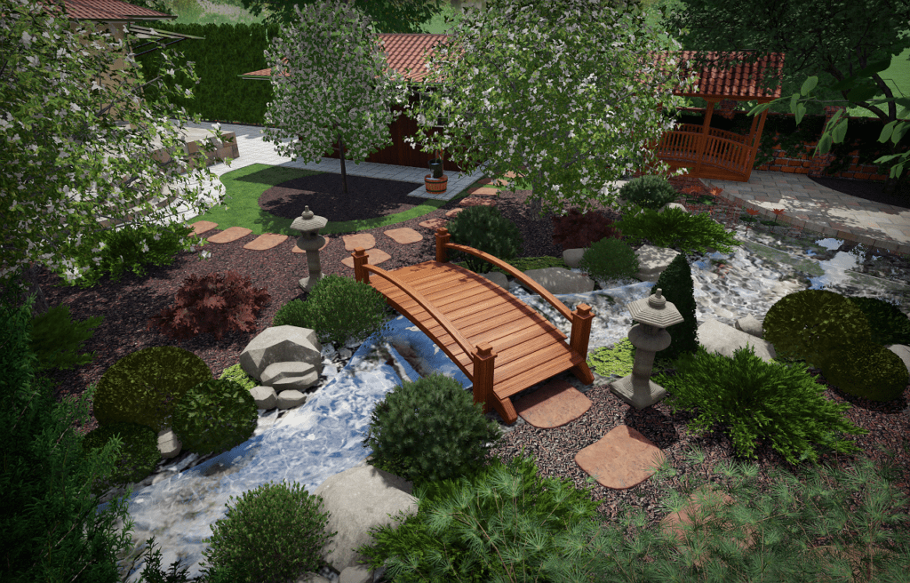 Az itt látható „japán kert” látványtervemen egy kertvárosi, családi kertben próbáltam megjeleníteni a japán kert néhány jellegzetes stíluselemét. A kanyargó vízfelület, a kövekkel szegélyezett patak, a fahíd, a lépőkövek és a formára nyírt örökzöldek (például a tiszafa) mind a japán kert hangulatát idézik, miközben a kert továbbra is jól használható, élhető marad a mindennapokban.